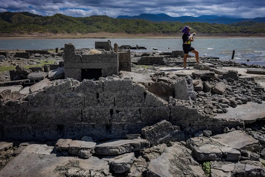 Тут, у водосховищі біля дамби Пантабанган, за 125 миль на північ від Манілли, діти стрибають і лазять серед залишків зруйнованих будинків, туристи роблять селфі, а місцеві рибалки переправляють відвідувачів на крихітний острівець, який колись був повністю затоплений, а тепер виринув на поверхню відтоді, як водосховище було вперше заповнене в 1970-х роках.