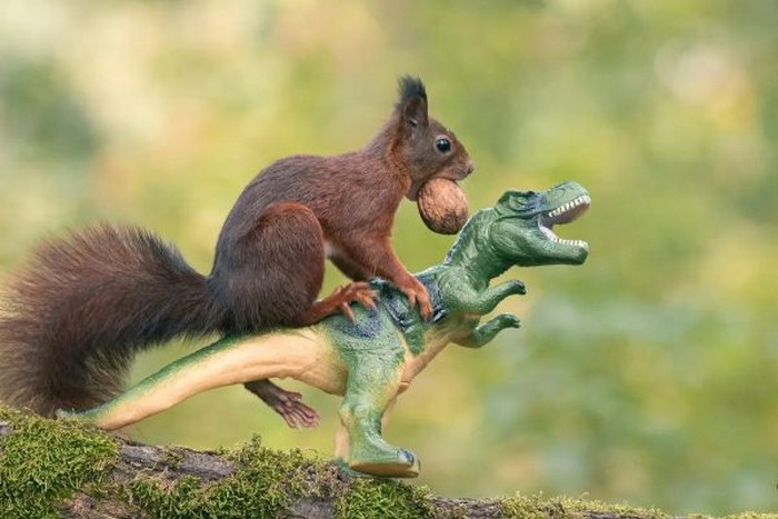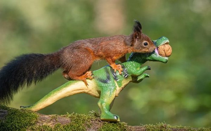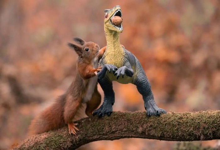 Поєднавши дві свої пристрасті — рудих білок і динозаврів, бельгійський фотограф створив чарівну серію фотографій, на яких білки крадуть горіхи у страшних іграшкових істот.