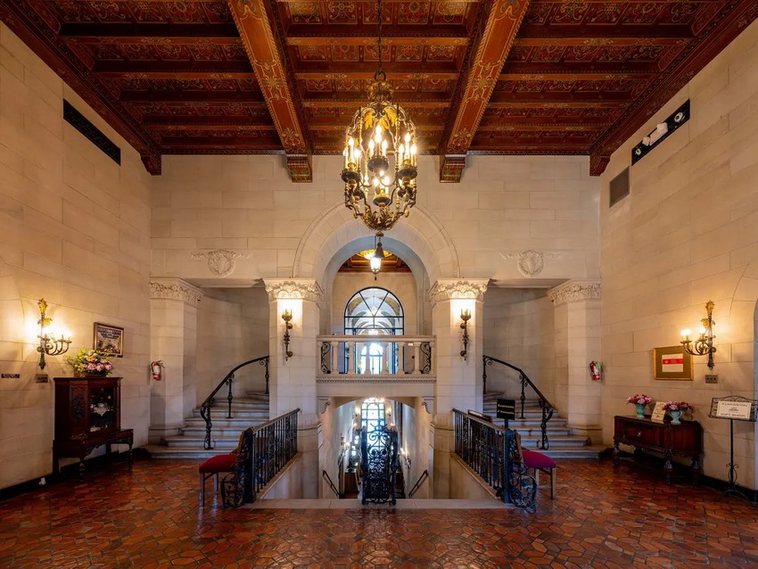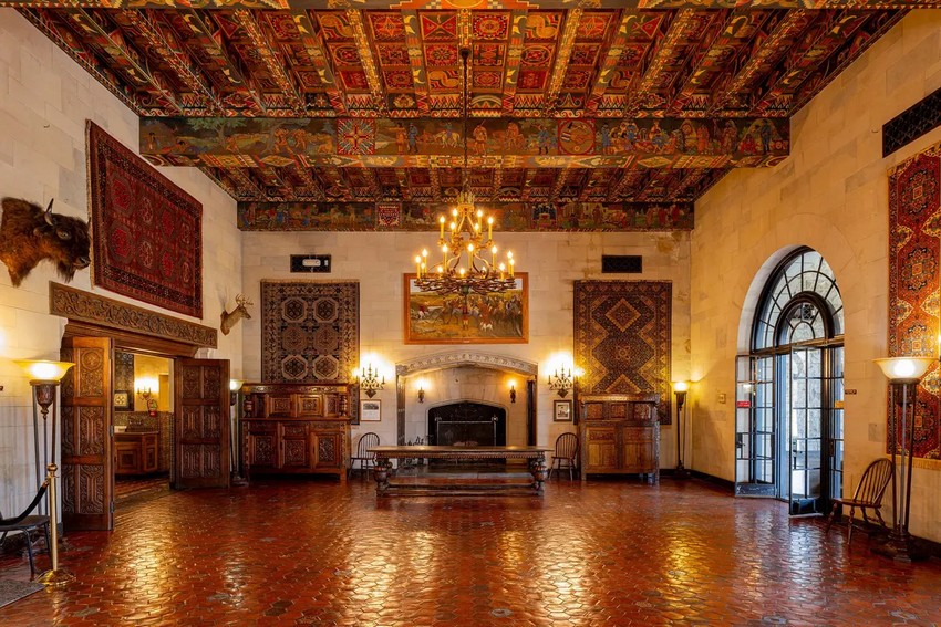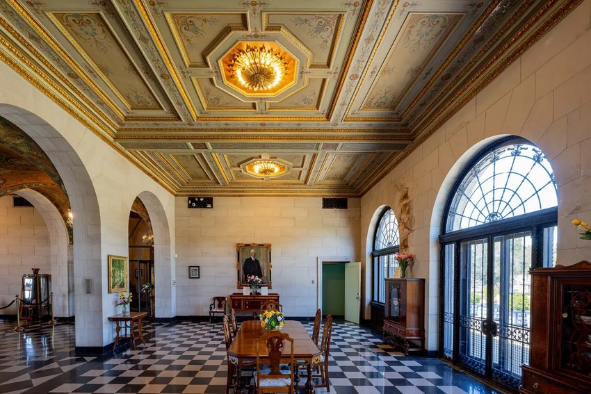 Величні подвійні мармурові сходи піднімаються від вестибюля до лоджії на другому поверсі і спускаються до галереї на першому поверсі. У будинку було 861 лампочок, що освітлювали інтер'єр, багато з яких були встановлені в таких вишуканих свічниках, як ця бронзова люстра. Стіни побудовані з вапняку, а велика палладіанська арка обрамлює сходи. Коване залізо, яке можна побачити в інтер'єрі, є типовою рисою тосканської архітектури. (Kit Leong/Shutterstock)У лоджії знаходиться складно розписана стельова фреска Вінсента Марагліотті. Дизайн натхненний китайськими мотивами Чіппендейла, що поєднують готичні та азіатські елементи. Фреска, намальована Марагліотті на плоских полотнах, була потім нанесена на вигнуті гіпсові склепіння. Підлога в клітинку — це тераццо, суміш подрібненого мармуру та бетону, залита в латунні роздільники. (Kit Leong/Shutterstock)Друга дружина Е. В. Марланда, Ліді, любила танцювати. У великому бальному залі особняка з позолоченими стельовими касетами та двома величезними кришталевими люстрами Waterford Ліді проводила багато вечорів, танцюючи під музику. Її портрет висить праворуч від каміна, на ньому вона зображена в іспанській сукні та мантільї. Портрет Марланда висить над каміном, а портрет його прийомного сина Джорджа — ліворуч. (Kit Leong/Shutterstock)По боках лоджії розташовані Північний салон і Південний салон, де Е. В. Марланд і Ліді Марланд приймали гостей на офіційних заходах. Північний салон (на фото) також називали Сонячною кімнатою. Він має стіни, оздоблені італійською штукатуркою, і стелю з золотою облямівкою, яка була багато розписана Вінсентом Марагліотті. (Kit Leong/Shutterstock)Ліворуч від фойє розташована велична їдальня в елізабетянському стилі. Різьблені панелі виготовлені з обрізаного англійського дуба, взятого з королівських лісів за спеціальним дозволом короля. Обрізання — це суворий метод обрізки, який змушує дерева рости з унікальною текстурою, що є бажаною для шпону та панелей. Кімната увінчана бочкоподібною стелею з литого гіпсу. (Kit Leong/Shutterstock)У внутрішній вітальні, або зимовій кімнаті, на стелі зображена фреска, що зображає історію рівнин округу Кей, штат Оклахома. Фреска, намальована Вінсентом Марагліотті, простягається по стелі в хронологічному порядку, починаючи з доколумбового індіанського поселення на південній балці. З правого боку величезного каміна знаходиться таємні двері до безпечної кімнати, де в разі небезпеки могли б сховатися члени сім'ї або високопоставлені гості. (Kit Leong/Shutterstock)Копія статуї Джорджа Робертса (прийомного сина Е. В. Марланда) стоїть у саду навпроти західного входу в особняк. Це одна з трьох французьких вапнякових статуй, які Марланд замовив скульптору Джо Девідсону для свого особняка. Оригінальні роботи Девідсона зараз стоять біля входу в будинок. (Richard G Smith/Shutterstock)