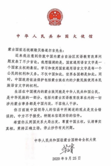 25 вересня посол Китаю в Монголії Чай Веньжуй в листі пригрозив, що всі справи, пов'язані з Внутрішньою Монголією, в тому числі програма двомовної освіти в монгольських школах — це внутрішні справи Китаю, і не допускається ніяке втручання з боку.