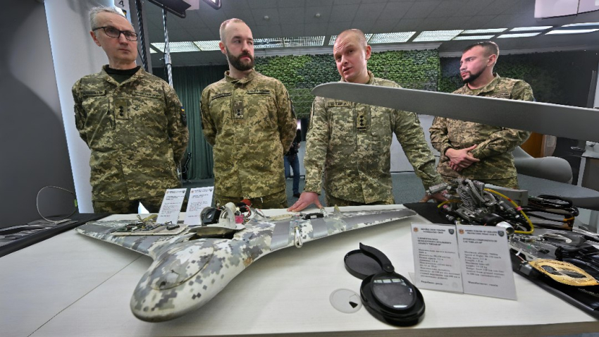 Українські військові експерти демонструють збиті дрони, які Росія використовує для нанесення ударів по критично важливих об'єктах інфраструктури та інших цілях в Україні, під час пресконференції в Києві 15 грудня 2022 року. (SERGEI SUPINSKY/AFP via Getty Images)