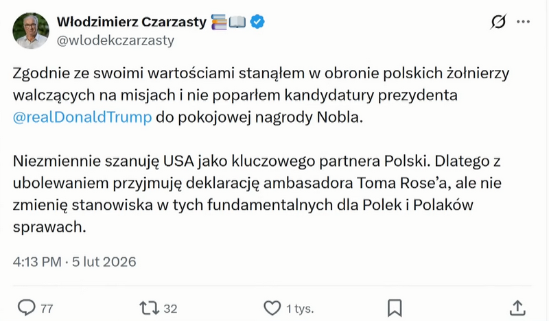 Посол США у Варшаві Том Роуз у четвер оголосив про припинення будь-яких контактів зі спікером Сейму Польщі Влодзімєжем Чарзастим, звинувативши його в образах на адресу президента США Дональда Трампа. Рішення стало реакцією на критику Чарзастим політики Трампа та його відмову підтримати ініціативу щодо висунення американського лідера на Нобелівську премію миру.