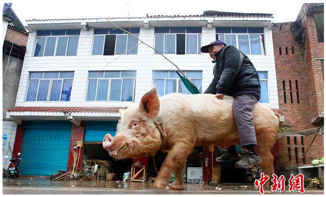 Крестьянин Цзян Чэнъю едет верхом по городу на одной из своих свиней. Он стал так поступать после того, как несколько месяцев назад заболел и стал не в состоянии ходить на большие расстояния.