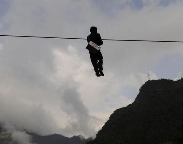 Врач бедного района Китая более 20 лет переправляется к своим больным через реку по канату
