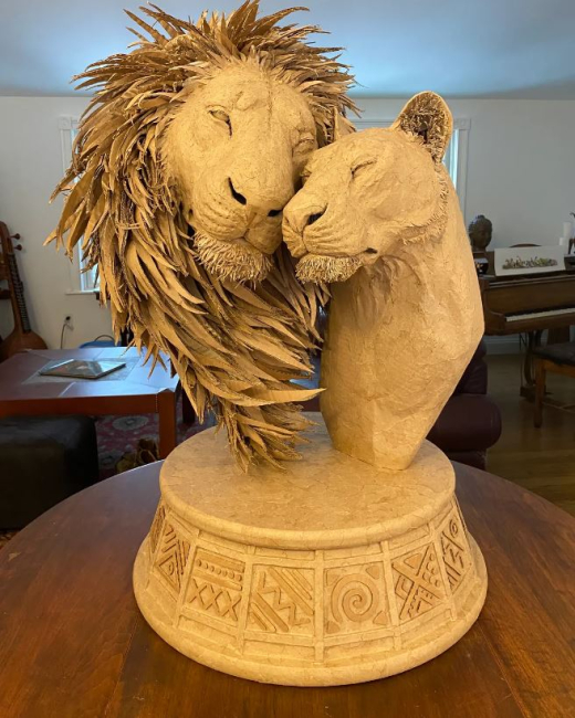 Потрясающе реалистичный портрет пары львов в любовных объятиях выполнен с такими изысканными деталями и изяществом, что трудно представить, что они сделаны из старого, использованного, изношенного упаковочного картона.