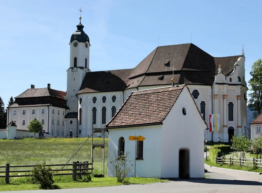 Место паломничества с 18 века, Баварская церковь Виса (Wieskirche) на юге Германии у подножия Альп, является шедевром архитектуры рококо, стиля, возникшего в период позднего барокко. Она спроектирована и украшена братьями Доминикусом и Иоганном Баптистом Циммерманами.