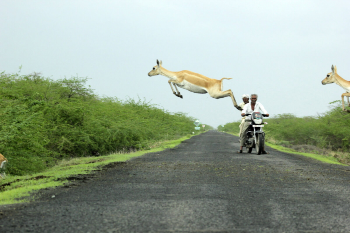 «Между тем, мимо проезжал мотоциклист, и казалось, что антилопа прыгала через мотоцикл. Фотография выглядит так, будто они информируют нас, что эти джунгли наши, поэтому, пожалуйста, держитесь от них подальше и дайте нам дорогу, чтобы пройти».