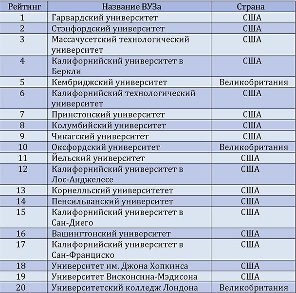 В этом году в рейтинге лучших ВУЗов мира лидируют ВУЗы США, Великобритании, Германии, Канады, Франции, Австралии, Японии, Швейцарии. Швеции, Нидерландов, Дании, Бельгии, Израиля, Норвегии, Финляндии, России (Московский государственный университет — 77 позиция и Петербургский государственный университет — третья сотня рейтинга), Китая и других стран.