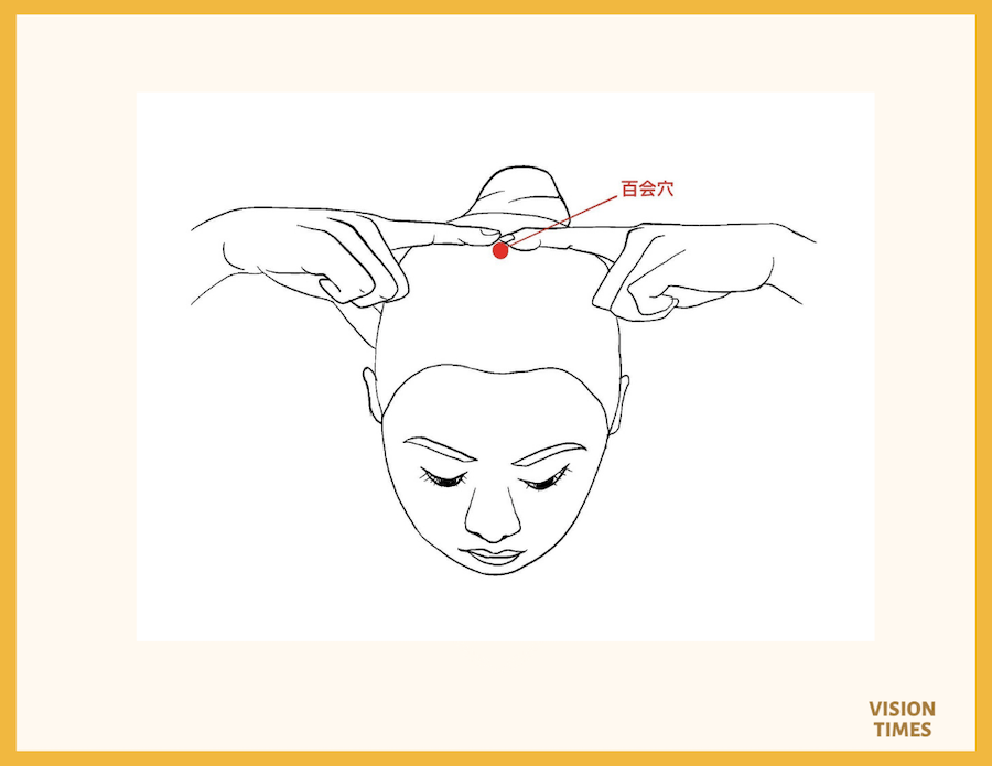 Точка Байхуэй расположена посередине верхушки головы, регулярный массаж этой точки может успокоить рассудок, приподнять ян и лечить выпадение волос.