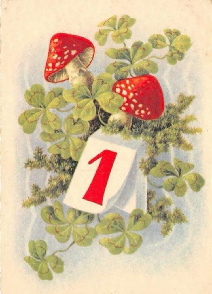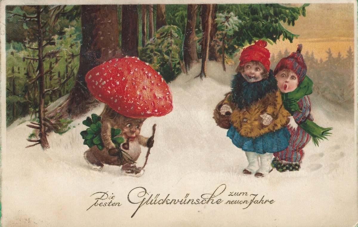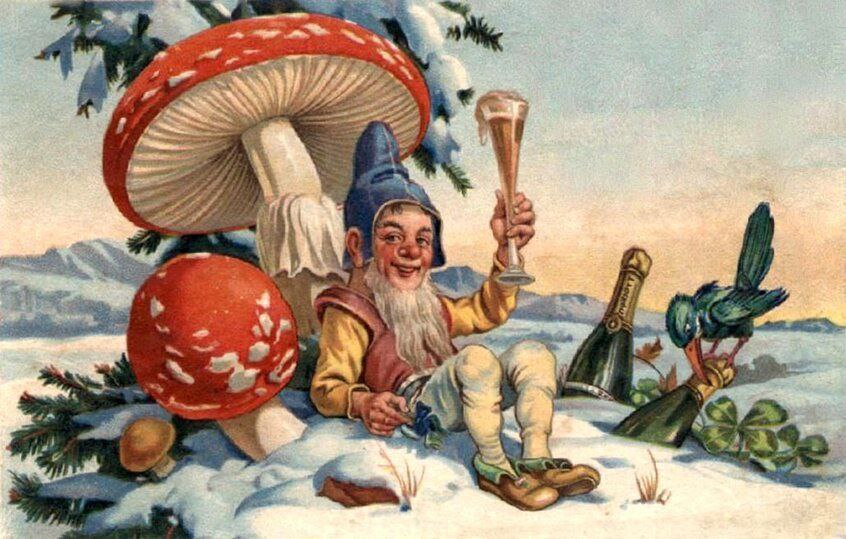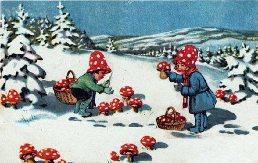Например, на старинных европейских рождественских открытках можно встретить … мухоморы! Согласитесь, очень странно на первый взгляд? Ярко-красная шляпка в белый горошек ассоциируется скорее с лесной сказкой или детской иллюстрацией, чем с рождественскими праздниками. И всё же в старину их частенько рисовали на открытках рядом с еловыми ветками, свечами, гномами и снегом. Откуда появились там мухоморы и что значили подобные иллюстрации?