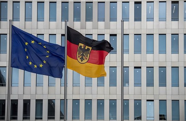 Флаги ЕС и Германии перед зданием Федеральной разведывательной службы Германии (BND) в Берлине, 19 мая 2020 года. (JOHN MACDOUGALL/AFP via Getty Images)