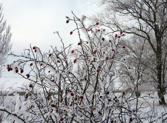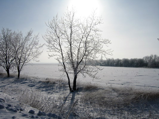 Полумрак утра постепенно рассеивается, становятся видны заснеженные обочины. Восходит солнце, и голубые тени придорожных посадок протягивают свои гибкие спины вдоль холмов, деревья кутаются в пушистый иней. Замерла морозная тишина: ни ветерка.
