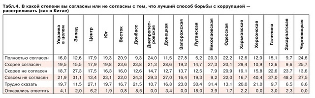 Что касается такого способа борьбы с коррупцией как расстрел, то 16% опрошенных поддержали его полностью, а 19,5% сказали, что скорее поддерживают, чем не поддерживают его. Больше всего тех, кто поддерживает такую жёсткую меру — среди жителей Николаевской, Донецкой и Черновицкой областей. Против этого — больше всего в Закарпатской области и Галичине.