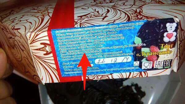 Фото: Tetiana Khytryk/Facebook.comАдрес изготовления кондитерского изделия указан следующим образом: «Луганская народная республика, г. Луганск, ул. Ленина, 261-а», что видно на фотографии, опубликованной в социальных сетях. На этикетке напечатано и название торта — «Луганский».
