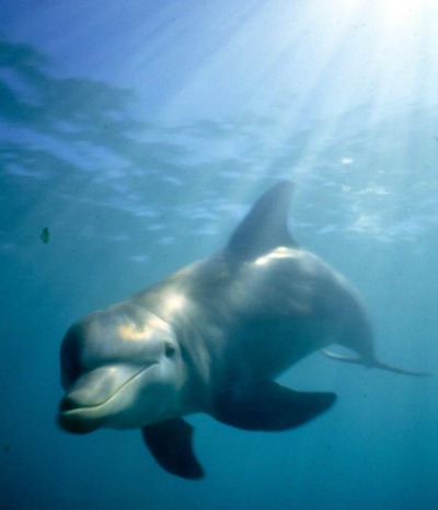 Одного разу, під час зйомок під водою, я почув часті клацаючі звуки. Коли я обернувся, приблизно в 10 футів від мене був дельфін. Сонячне світло, що проникало в товщу води, зробило цю зустріч незабутньою. Я зробив знімок, і дельфін поплив.